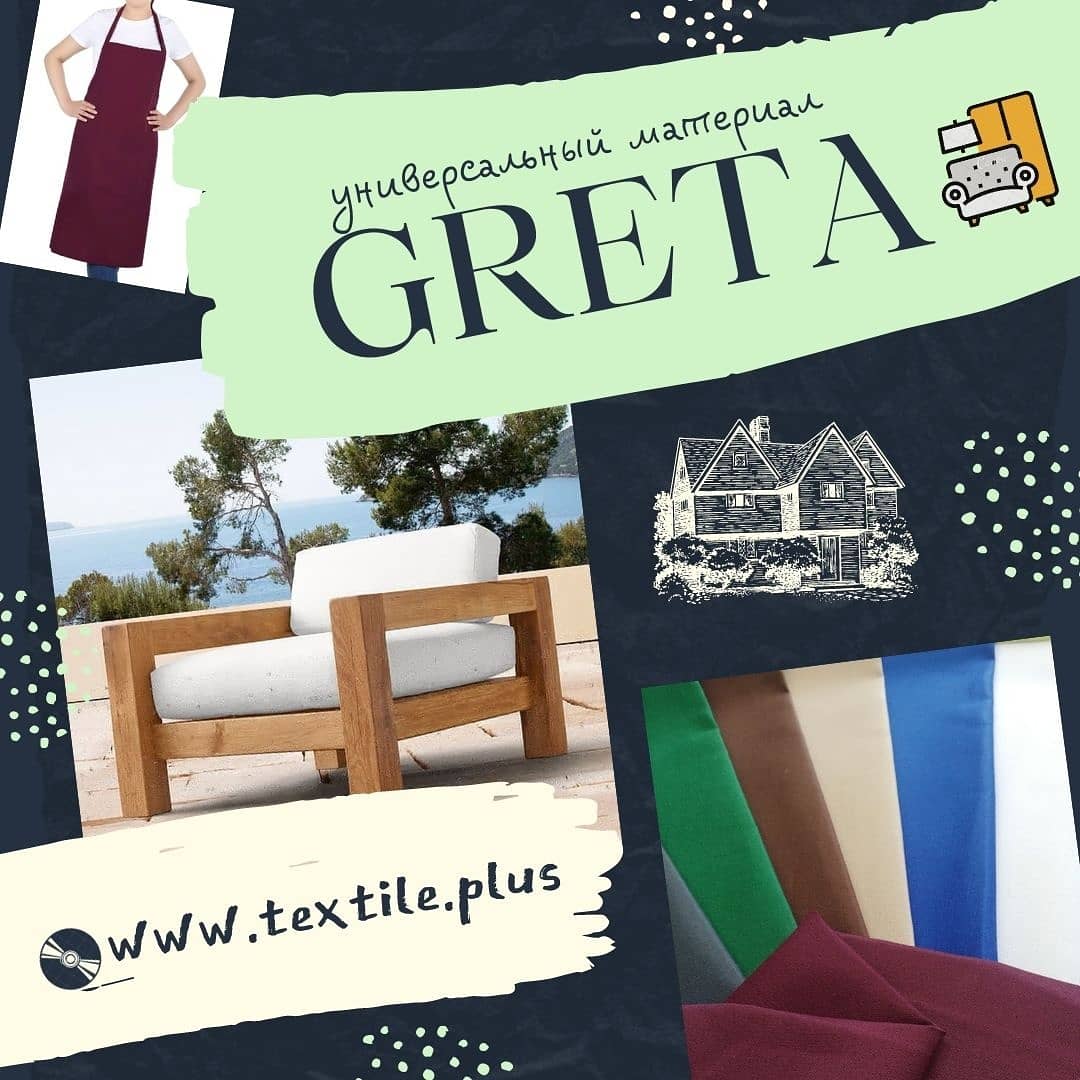 Ткань Грета (Greta) смесовое долговечное полотно с саржевым переплетением, которое состоит из волокон хлопка и полиэстера, лёгкое, с матовой поверхностью. При этом ткань воздухопроницаема, но не пропускает различные загрязнения, например, пыль. Ткань имеет водоотталкивающий эффект.